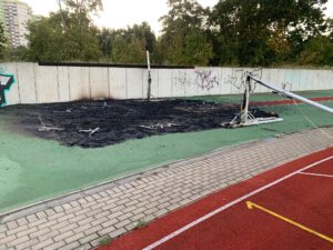 Stabhochsprunganlage im Stadion Finsterwalder Straße durch Feuer vollständig zerstört