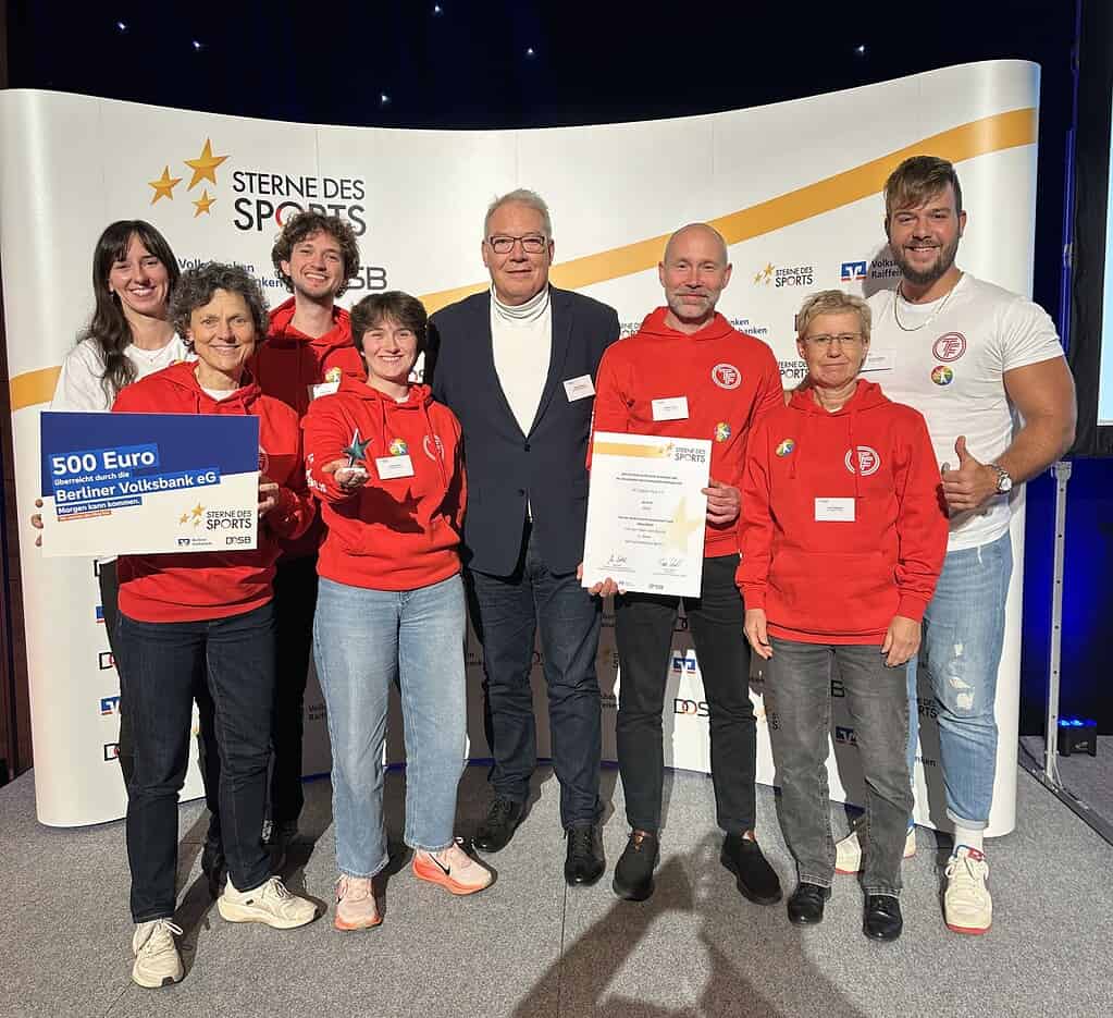 Mai dieses Jahres im Stadion Finsterwalder Straße! Sterne des Sports – was bedeutet das? Es ist die bedeutendste Auszeichnung für das gesellschaftliche Engagement von Sportvereinen! Der Deutsche Olympische Sportbund und die Volksbanken Raiffeisenbanken zeichnen Sportvereine aus, die sich besonders gesellschaftlich engagieren oder ihren Verein weiterentwickeln.