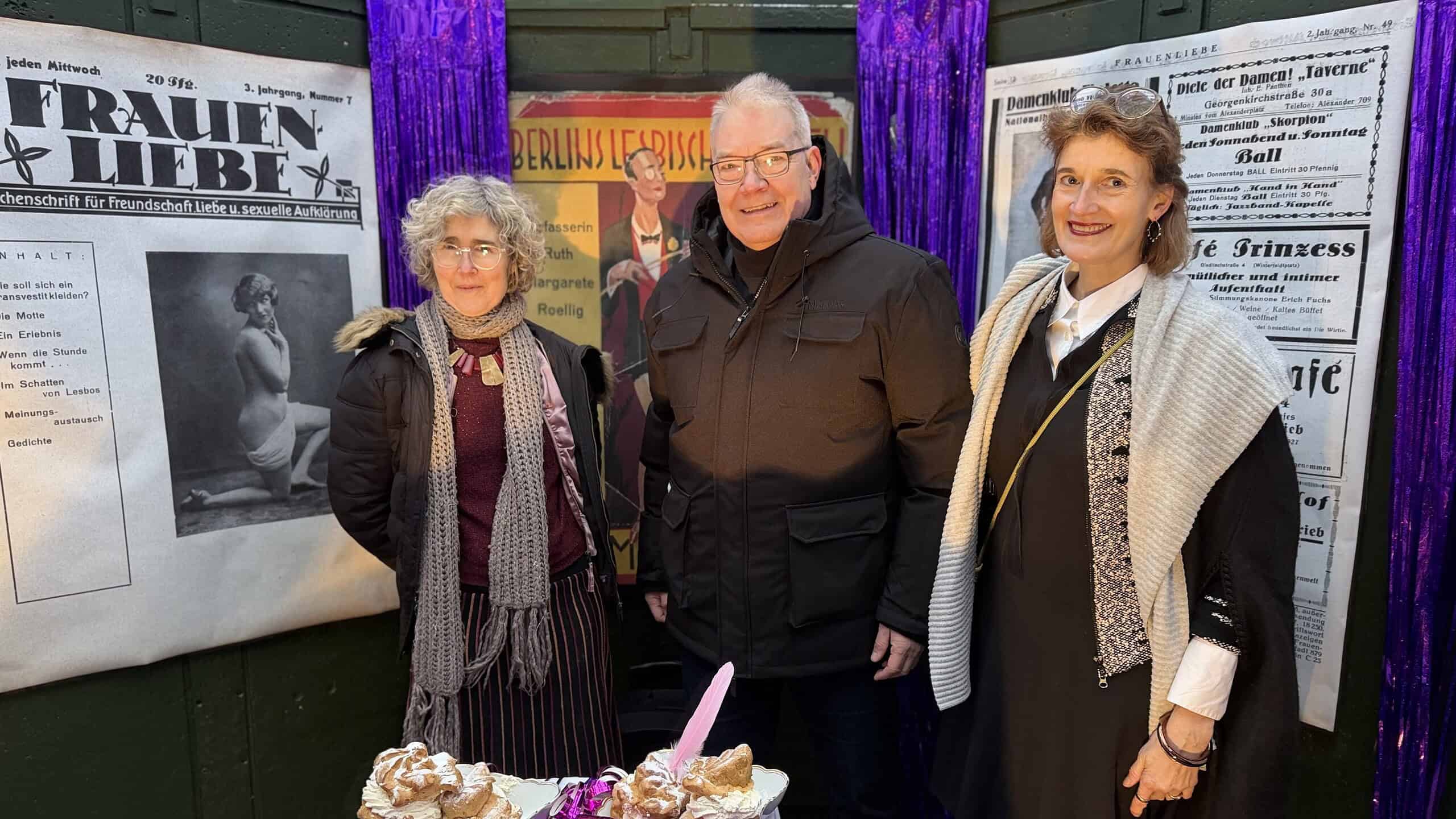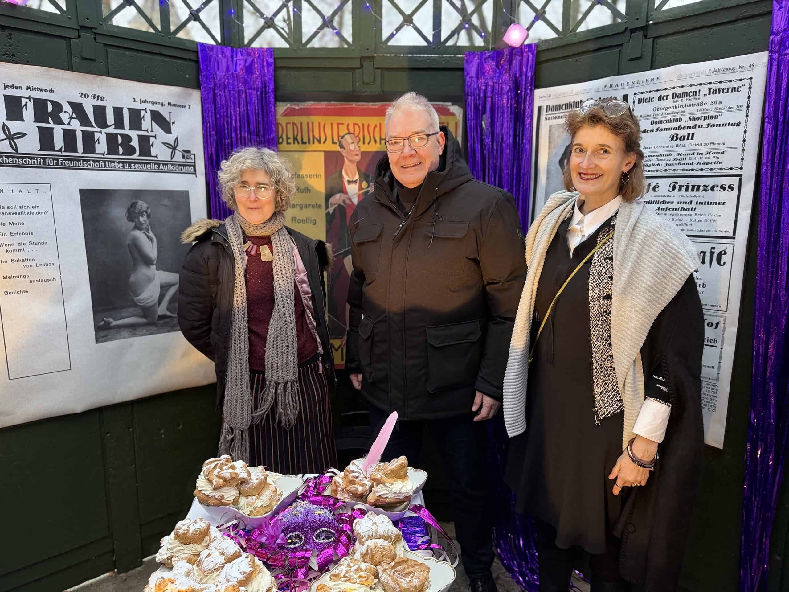 Der Bezirksstadtrat für Kultur, Harald Muschner (CDU), hat am Sonntagmittag, 25.1., die Lila Nächte im Museum Reinickendorf eröffnet. Zahlreiche Besucherinnen und Besucher nahmen an der Eröffnung im Café Achteck auf der Museumswiese teil und zeigten großes Interesse an der neuen künstlerischen Installation. In seiner Eröffnungsrede betonte Muschner die Bedeutung der Ausstellung für den Bezirk: „Die Lila Nächte stehen für Sichtbarkeit und die Erinnerung an das queere Leben der 20er- Jahre. Dass die Eröffnung so gut besucht war, zeigt, wie groß das Interesse an einer offenen Auseinandersetzung mit Geschichte und gesellschaftlicher Verantwortung ist.“