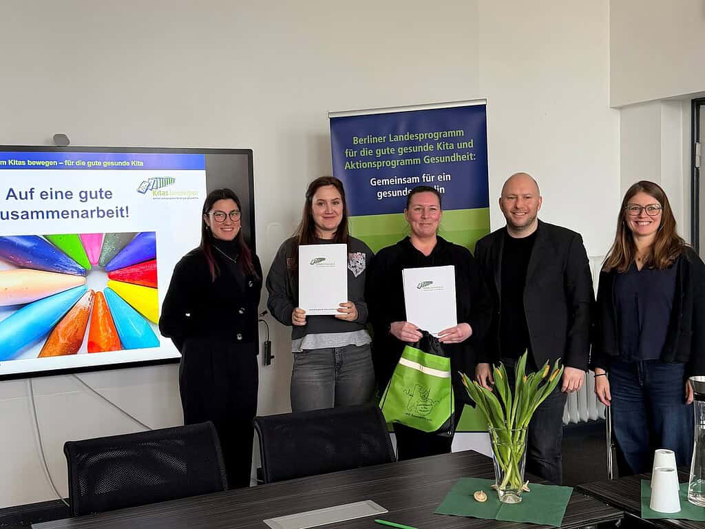 Die feierliche Unterzeichnung der Durchführungsvereinbarung für die neue Umsetzungsphase fand gemeinsam mit den Trägervertretungen und dem Bezirksstadtrat für Jugend und Familie, Alexander Ewers (SPD), statt: „Die wertvolle Arbeit der Mitarbeitenden in den Kitas, die Einbindung der Eltern, Träger und Kinder ist kaum hoch genug zu bewerten. Eine gesunde Atmosphäre in der Kita als Ganzes zu fördern, ist absolut unterstützenswert.“