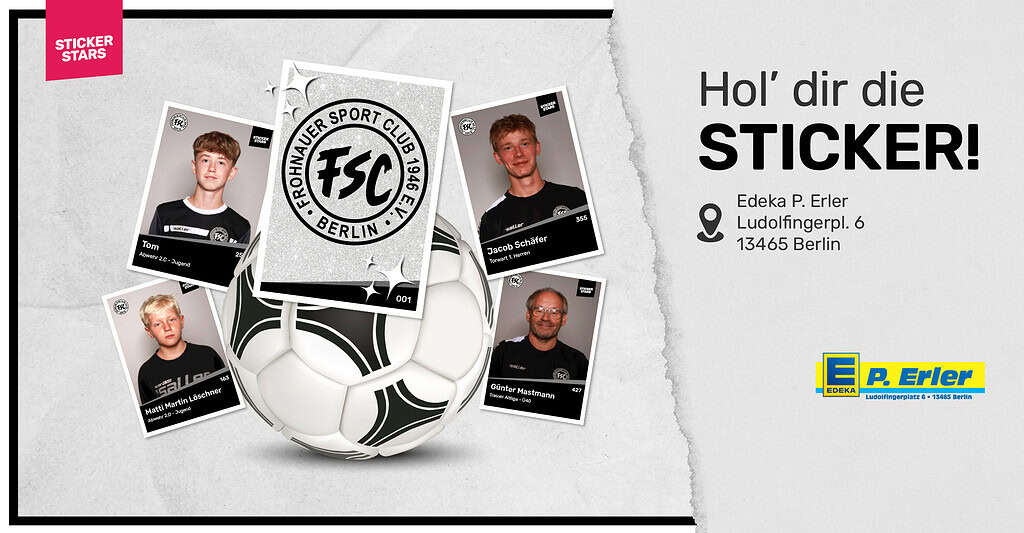 Das neue Stickeralbum des Frohnauer SC 1946 e. V. ist ab dem 26.09.2025 beim EDEKA P. Erler am Ludolfingerplatz in Frohnau erhältlich.