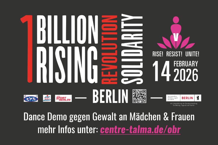 Das Centre Talma (das Reinickendorfer Mädchen- und Jungensportzentrum der Gesellschaft für Sport und Jugendsozialarbeit gGmbH) lädt am 14. Februar zur Teilnahme an der Tanzdemonstration „One Billion Rising“ vor dem Brandenburger Tor ein. Unter dem Motto „Women on Fire – Ni una menos“ werden ab 17.30 Uhr wieder einige tausend Menschen gemeinsam gegen Gewalt an Mädchen und Frauen tanzen. Außerdem wird es ab 16 Uhr Informations- und Aktionsstände vor dem Brandenburger Tor geben. Die Sängerinnen Jocelyn B. Smith, Lucille Mareen und Alex von Stella Rockt! werden zu den Tanzacts live performen.